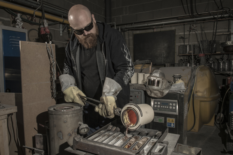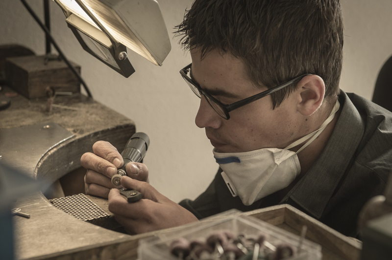 Voor iedereen die houdt van handgemaakte mooie spullen is de productie-eenheid van 2 Saints een eindeloos fascinerende plek. Vaklieden werken in brons en goud met traditionele technieken, terwijl technici 3D scanners en printers, hoogtechnologische machines voor wassen prototypes, laserlasmachines en CNC frezen bedienen. Een maatgieterij wordt bediend door Frederics broer, de andere ‘Saint’ in de merknaam 2 Saints.
